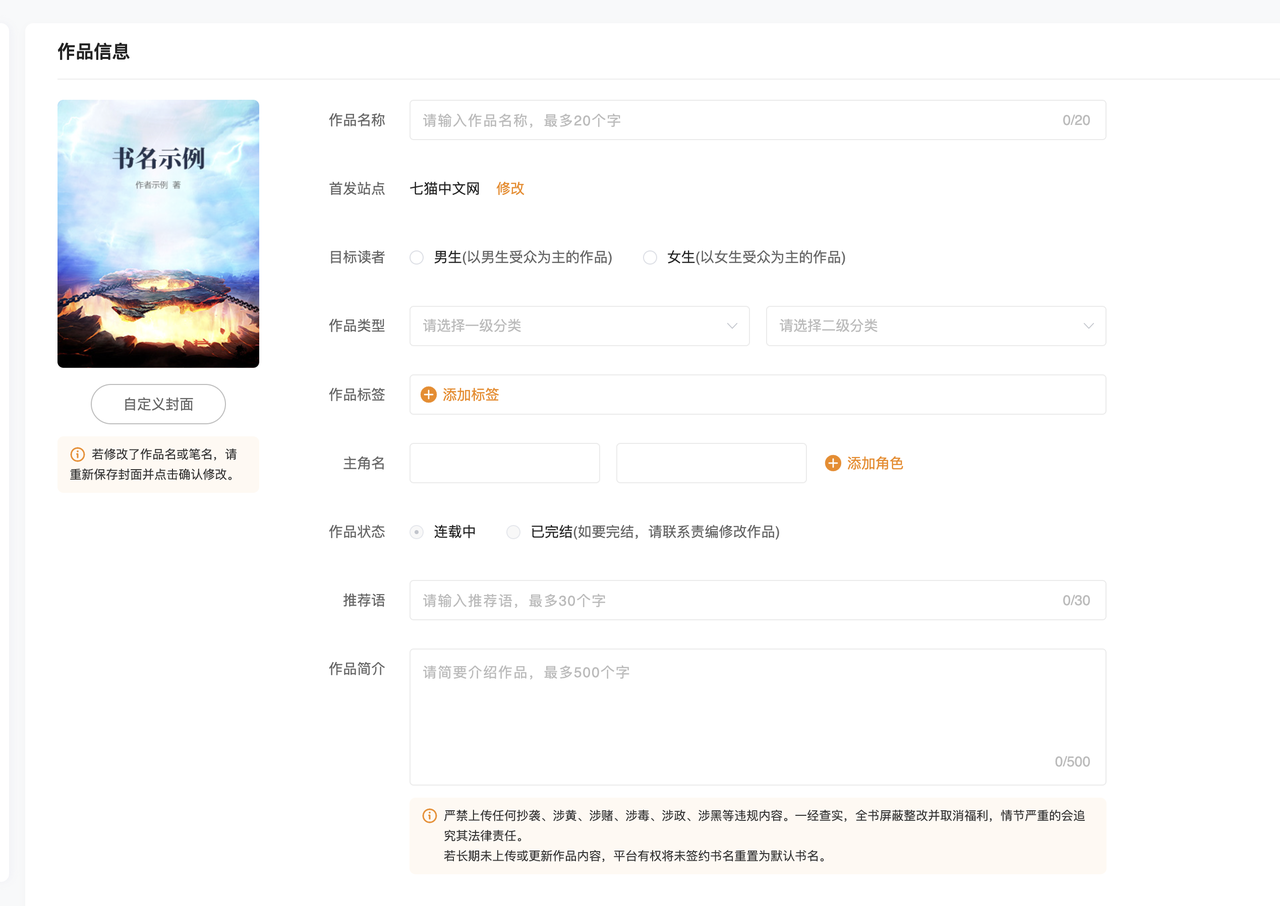 开篇两万字正文+大纲+投稿申请表 (下载《七猫中文网投稿申请表》)